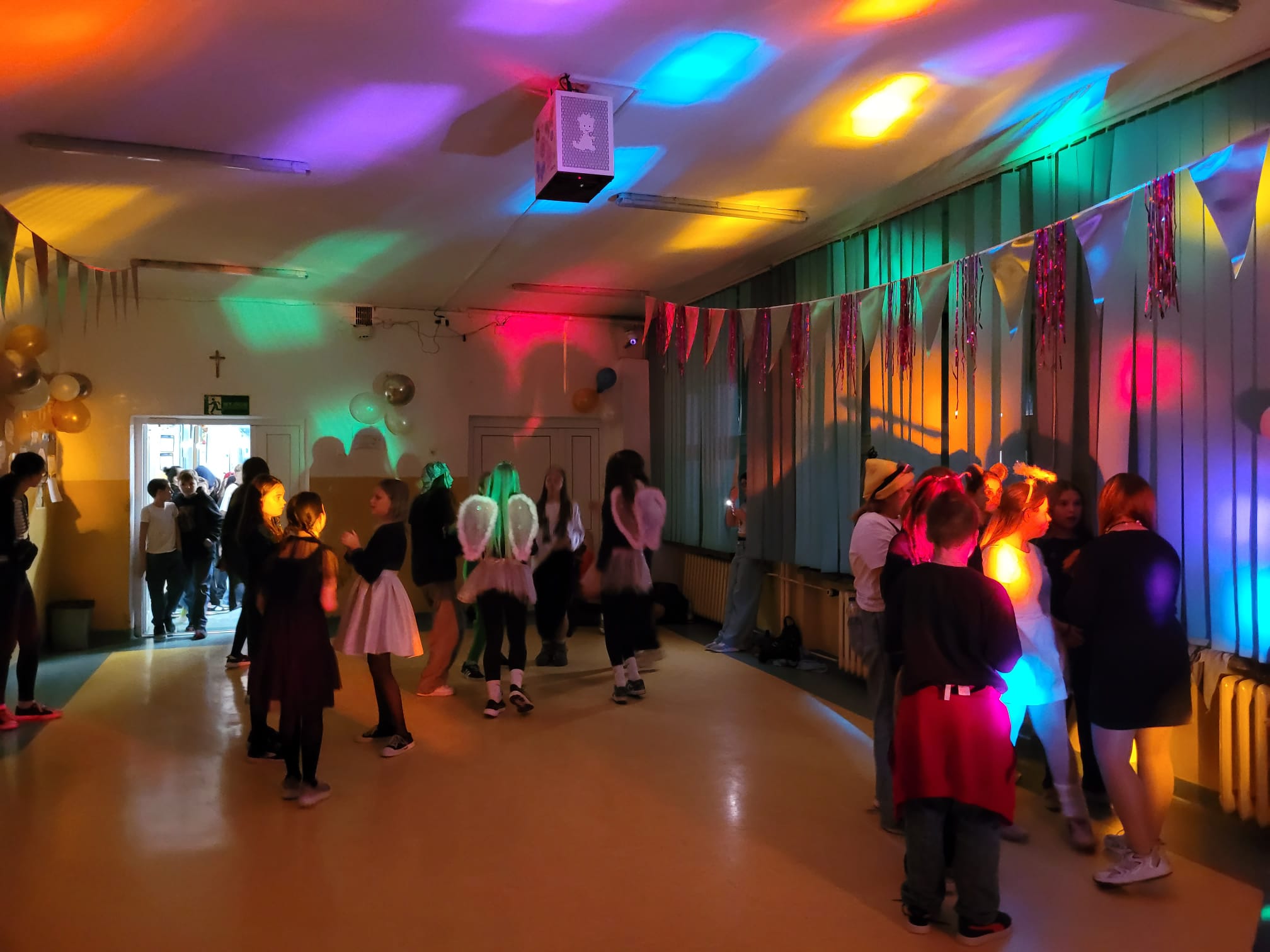 W czwartek w naszej szkole panowała prawdziwie magiczna atmosfera – wszystko za sprawą zabawy, którą dla klas 4–8 przygotował Samorząd Uczniowski wraz z opiekunem, panią Ewą Kurdyłą. Sala, pięknie udekorowana migoczącymi światełkami i andrzejkowymi akcentami, od razu wprowadzała w wyjątkowy klimat tego dnia a pomysłowe, kolorowe przebrania uczniów dodały zabawie jeszcze więcej uroku.