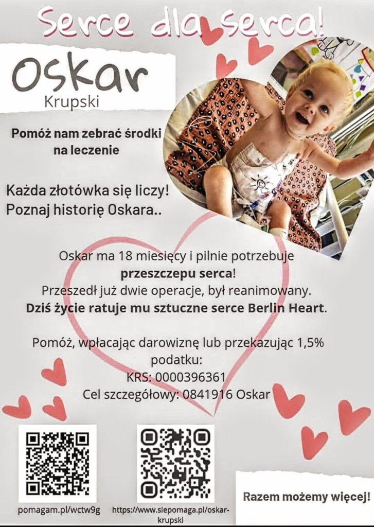 Oskar Krupski to osiemnastomiesięczny mieszkaniec Sanoka, którego czeka przeszczep serca. Obecnie serce Oskara nie jest w stanie pracować samodzielnie, a jego funkcje przejęła maszyna. Jedyny ratunek dla dziecka to przeszczep serca.
