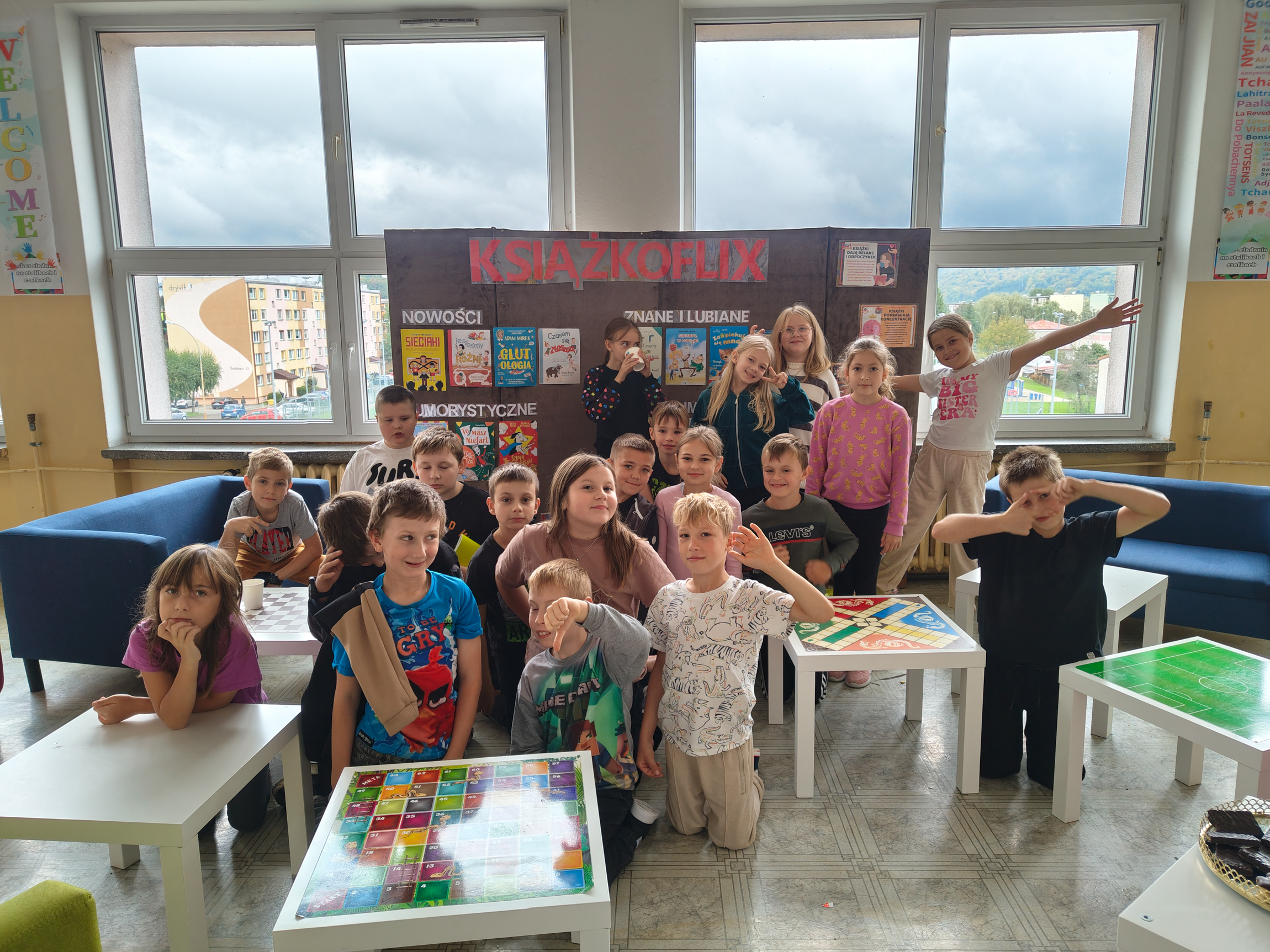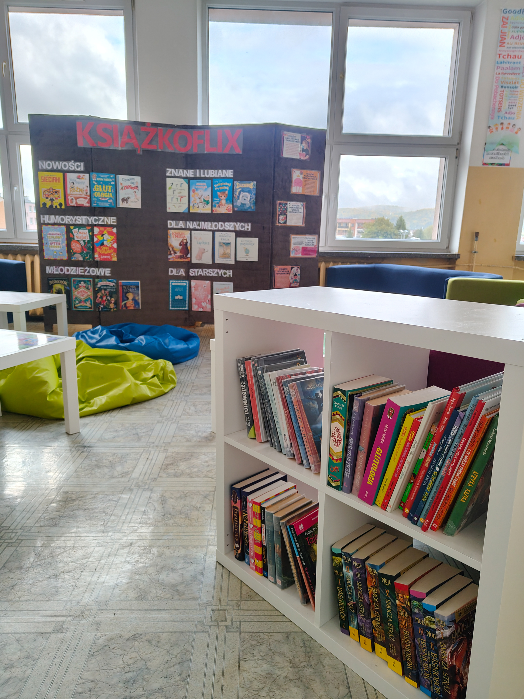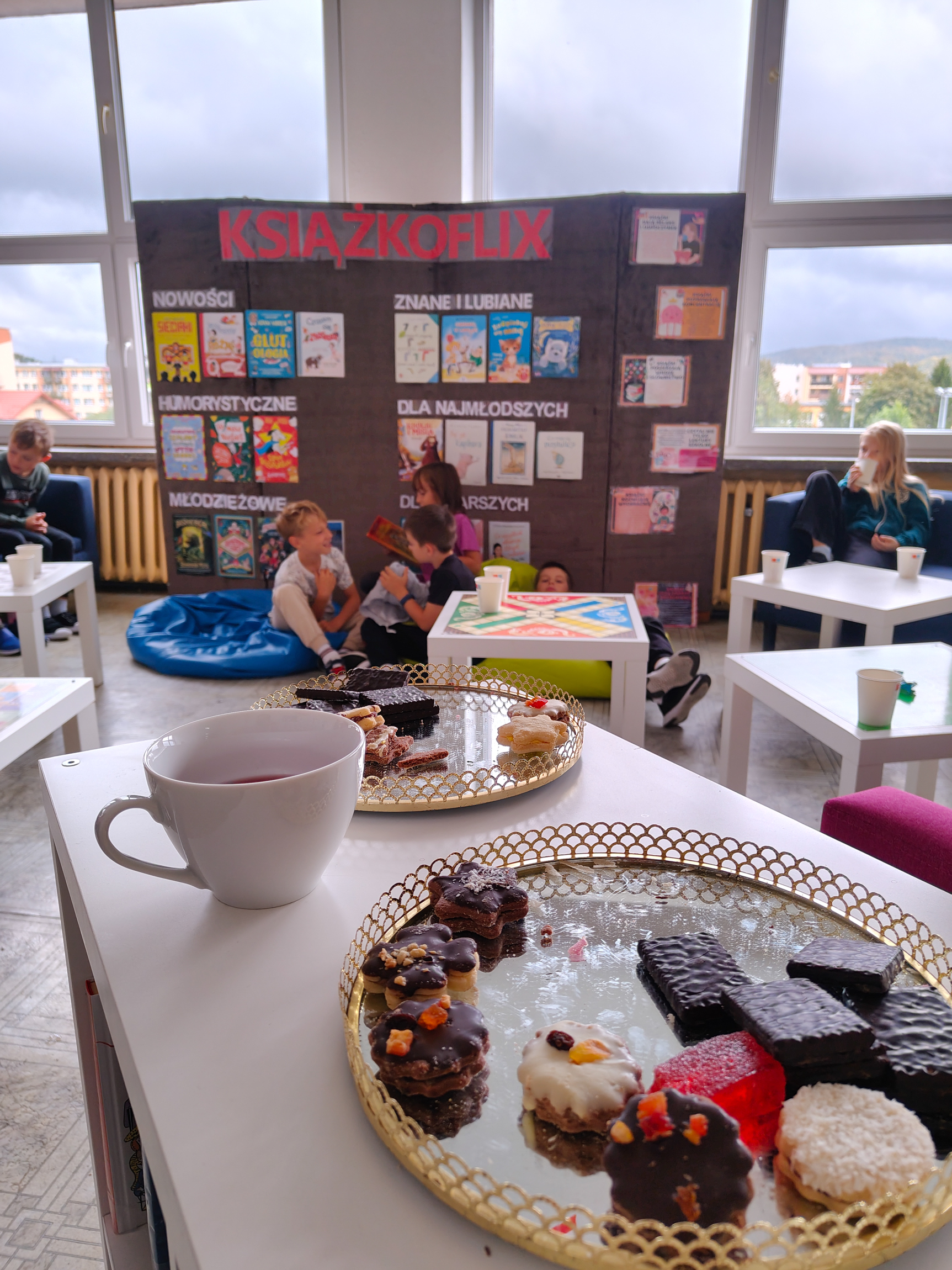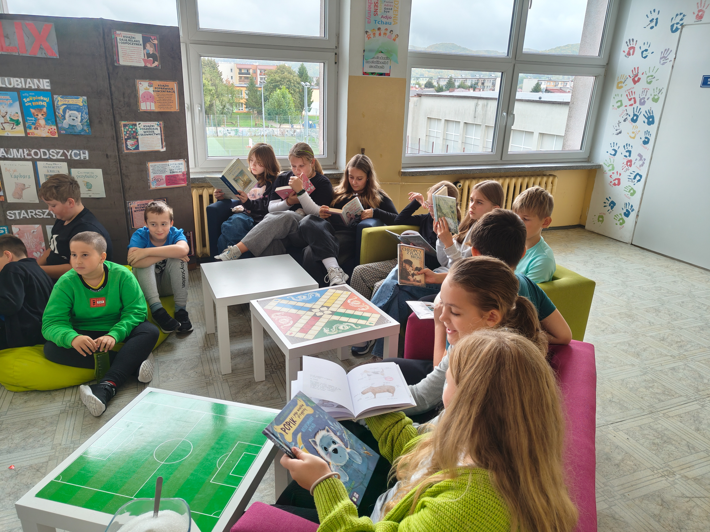 W tym roku przygotowaliśmy wiele różnorodnych aktywności. Uczniowie mogli odwiedzać „Zaczytaną Kawiarenkę”, w której z okazji Ogólnopolskiego Dnia Głośnego Czytania podczas lekcji polskiego słuchali fragmentów książek. W przestrzeni szkoły pojawiła się także gazetka promocyjna „KSIĄŻKOFLIX”, prezentująca nowości zakupione w ramach Narodowego Programu Rozwoju Czytelnictwa, która przyciągała spojrzenia i zachęcała do wypożyczania książek.