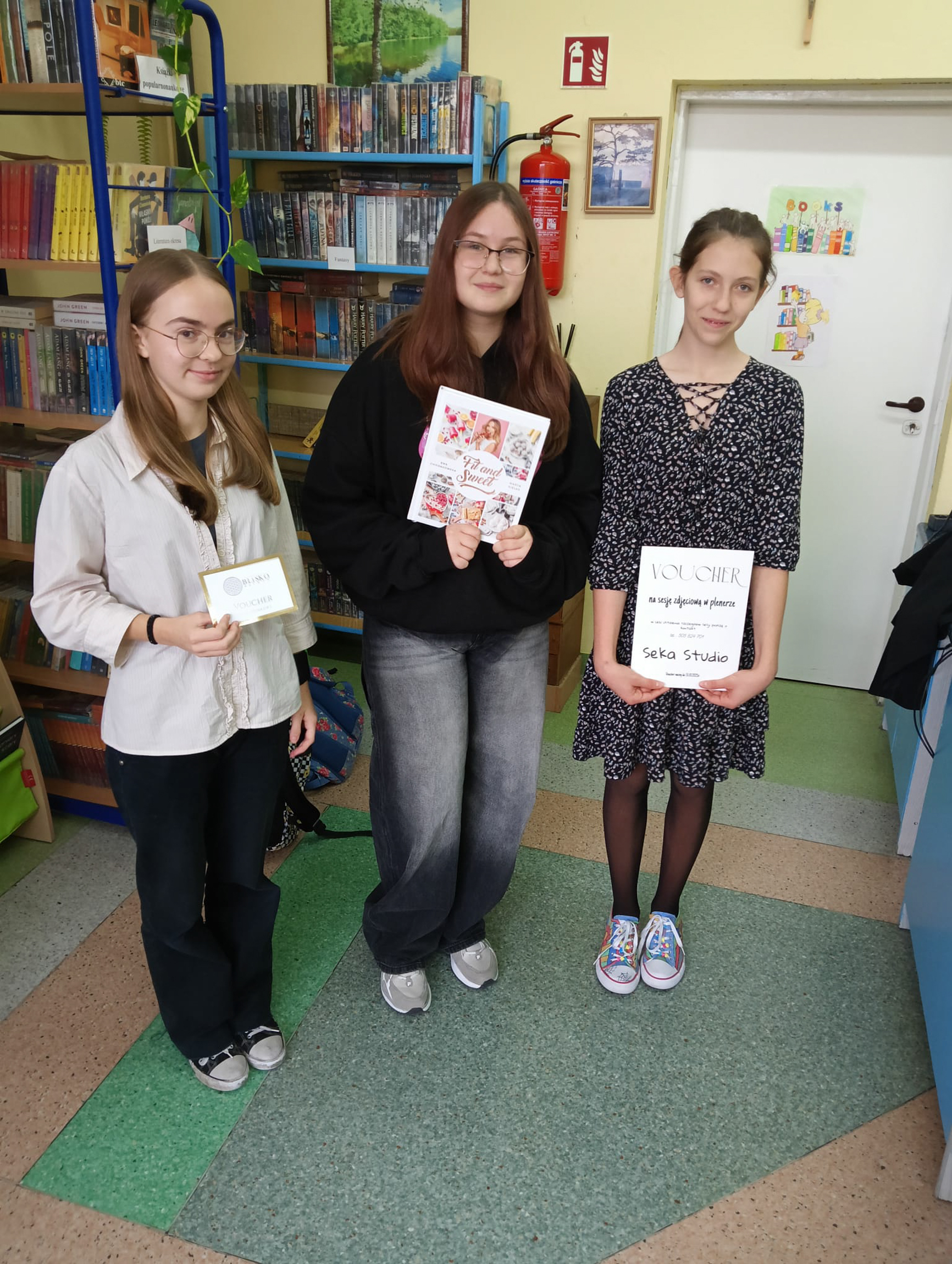 Podczas uroczystego zakończenia Miesiąca Bibliotek Szkolnych ogłoszono laureatów wszystkich konkursów, a zwycięzcy otrzymali dyplomy oraz nagrody rzeczowe. Uczniowie pokazali ogromną kreatywność, zaangażowanie i miłość do książek – zarówno w pracach plastycznych, sketchnotkach, jak i podczas czytania na żywo.