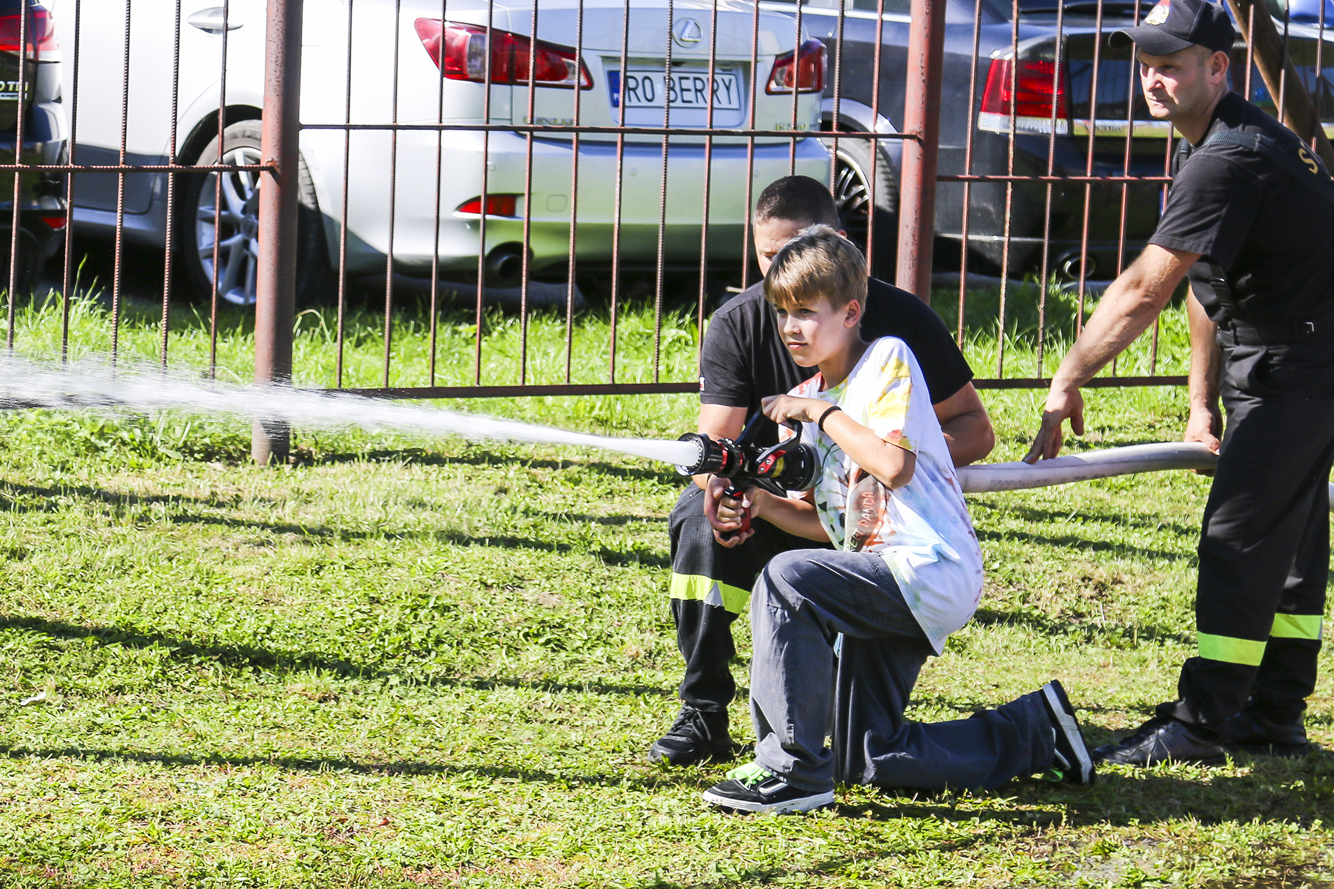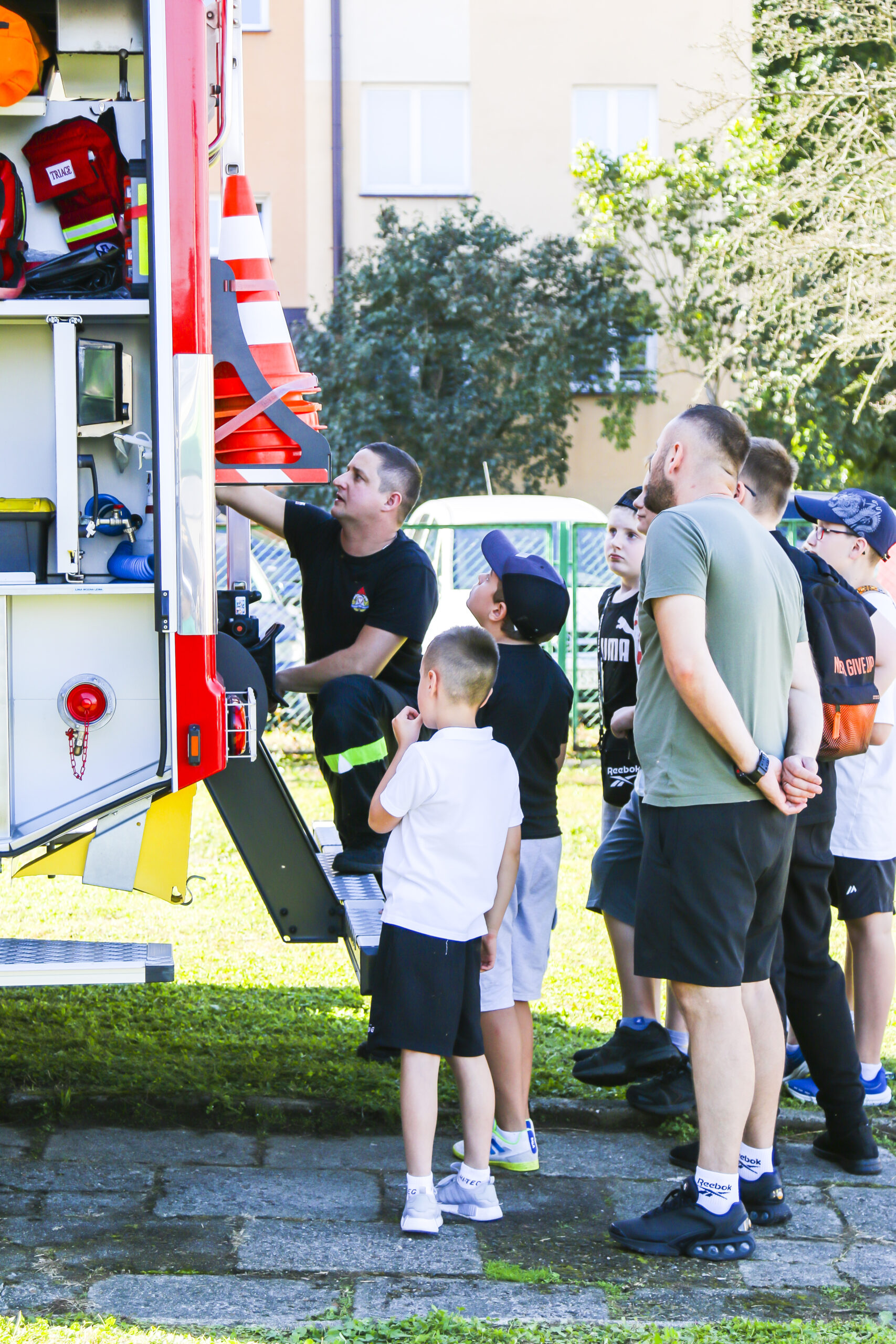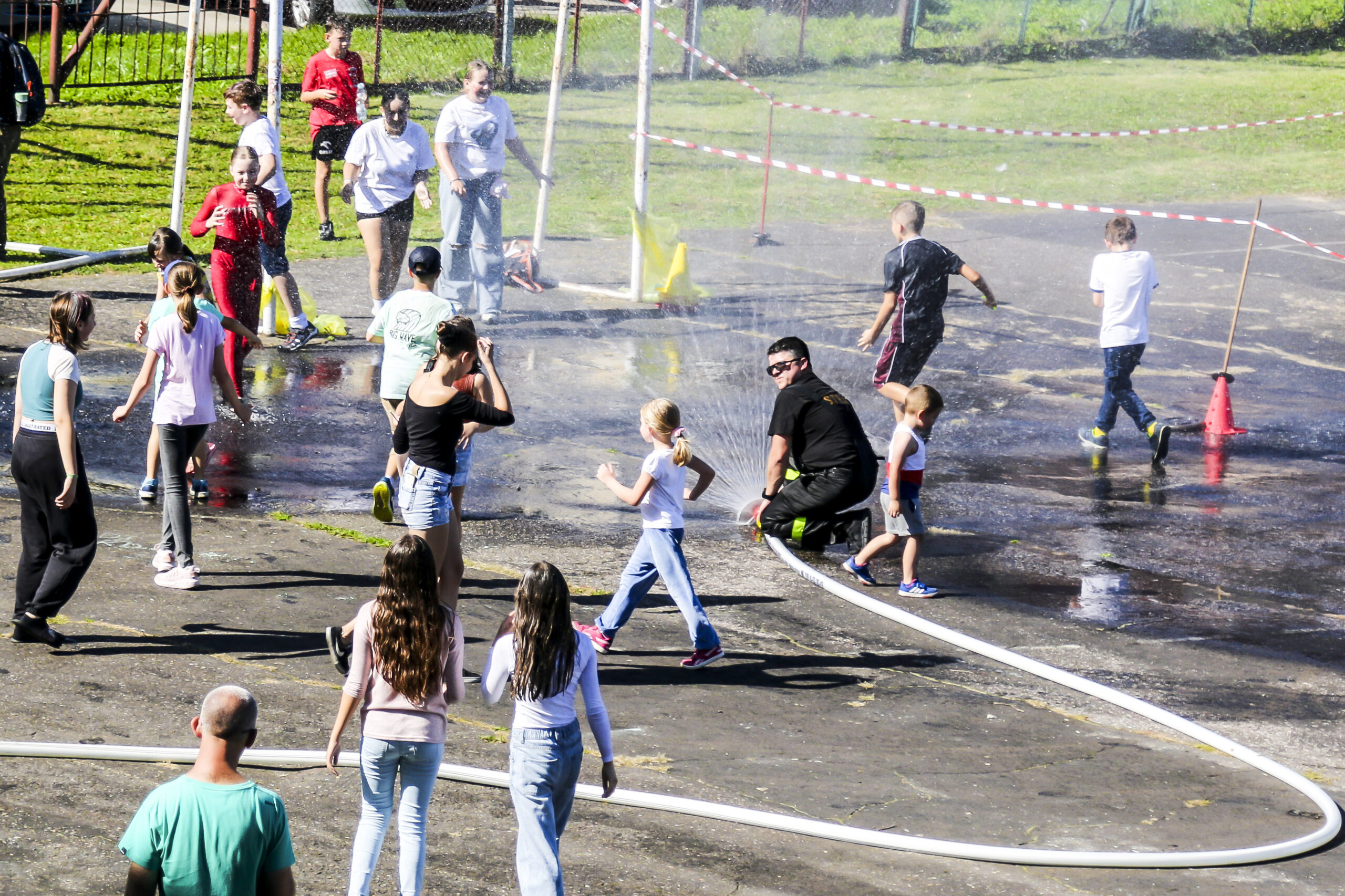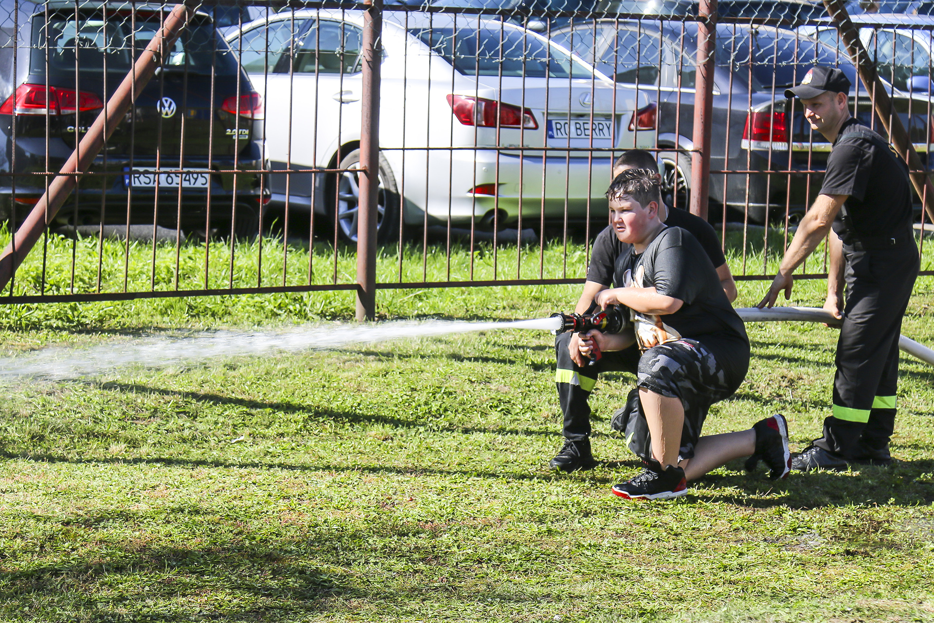 Uczestnicy mogli pooglądać wóz Straży Pożarnej. Szczególnie dużo radości sprawiła im wodna fontanna, w której mogli się pochlapać.