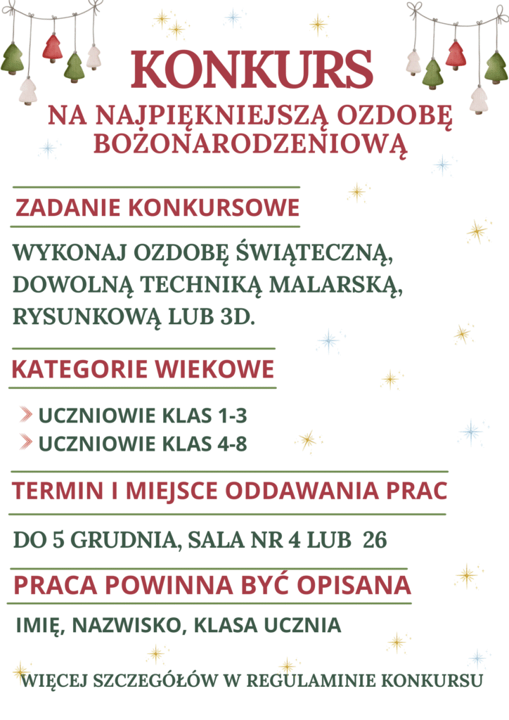 Zadanie konkursowe polega na własnoręcznym stworzeniu wyjątkowej ozdoby bożonarodzeniowej. Wszystkie prace zostaną przekazane na Szkolny Kiermasz Świąteczny, który rozpocznie się 8 grudnia. Dochód z kiermaszu w całości zostanie przeznaczony na potrzeby naszych uczniów i szkoły. Na autorów najpiękniejszych ozdób czekają atrakcyjne nagrody!