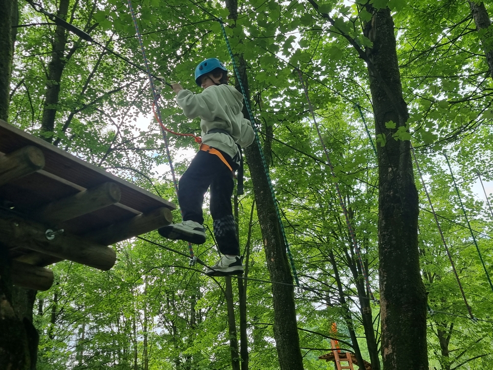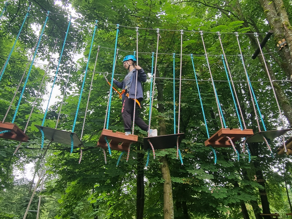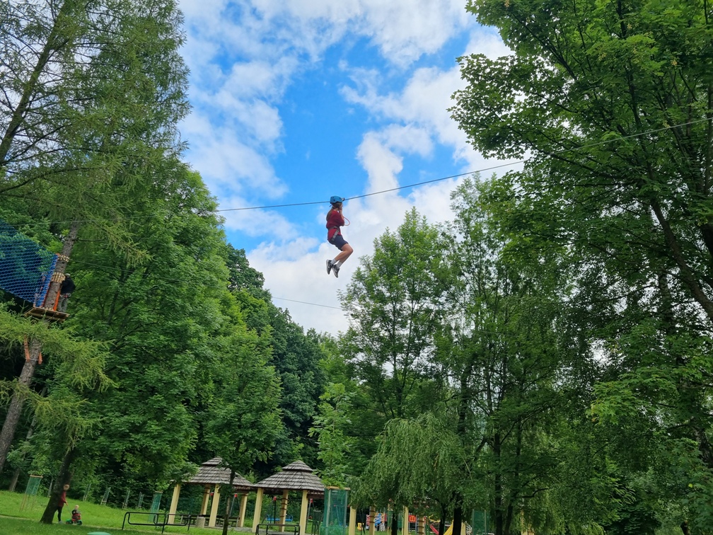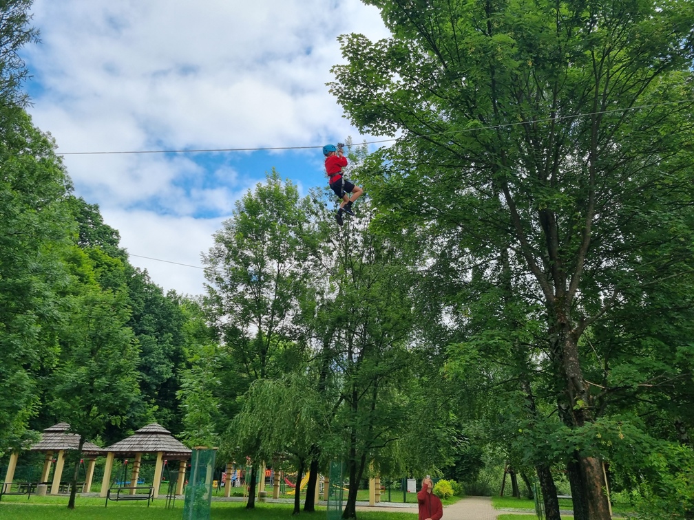 Następnie udaliśmy się do Parku Pod Dębami, gdzie w Parku Linowym świetnie się bawiliśmy, pokonując trasę junior z 15 przeszkodami – m.in. wiszące drabiny, poziome belki, wielką pajęczynę, huśtające się platformy itp. Chętni skorzystali także z tyrolki.