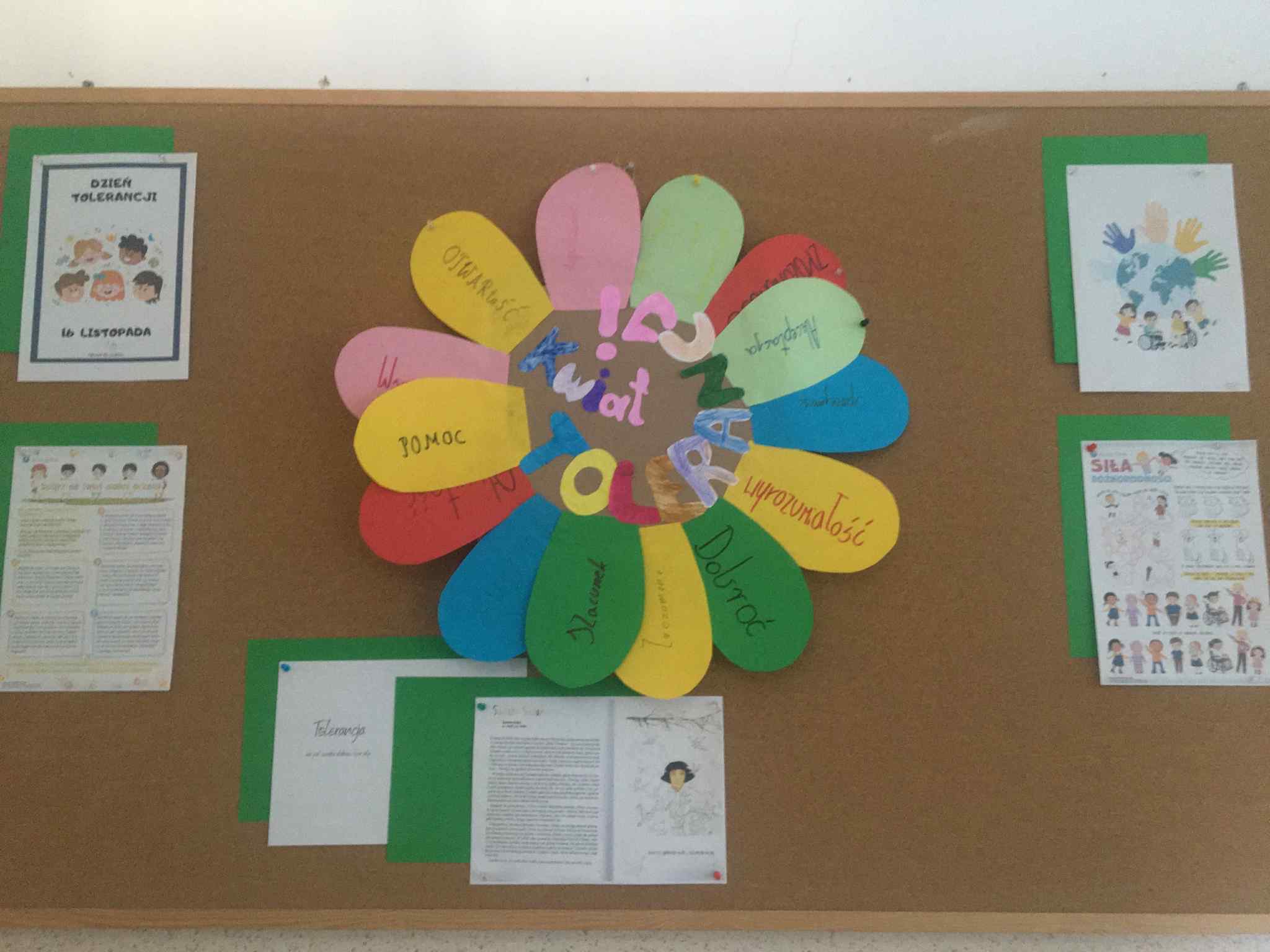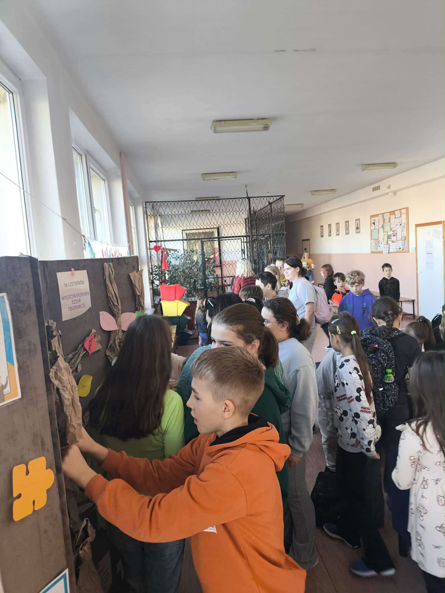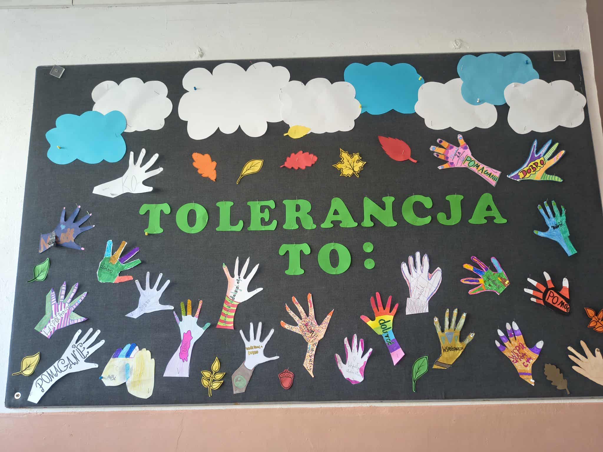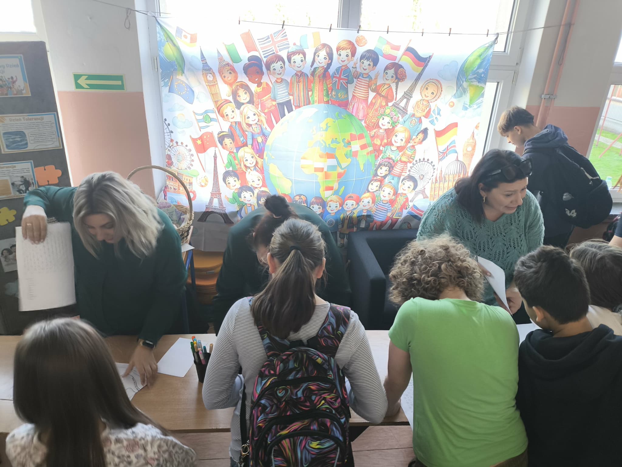 W czasie przerw uczniowie z klas 1-3 oraz kl.4-8 mieli okazję wziąć udział w różnorodnych aktywnościach, które w formie zabawy przybliżały im znaczenie tolerancji. Zajęcia zostały dostosowane do wieku uczestników, a ich forma zachęcała do aktywnego udziału. Dzieci tworzyły Drzewo Tolerancji, na którym umieszczały kolorowe listki ze słowami związanymi z tolerancją , akceptacją i życzliwością, układały puzzle z hasłami promującymi tolerancję oraz brały udział w Tolerancyjnym Kole Fortuny, gdzie czekały na nie zadania wymagające współpracy, refleksji i otwartości. Uczniowie chętnie uczestniczyli w zabawach, a szkolny korytarz tętnił pozytywną energią.