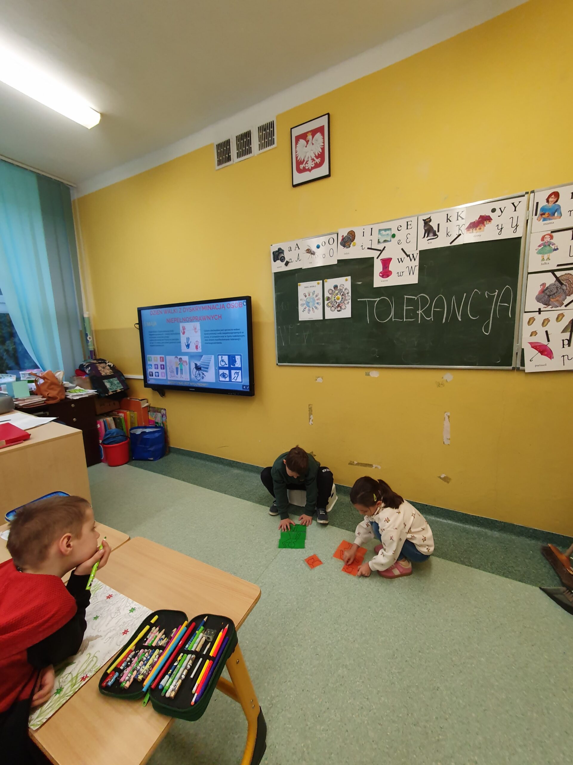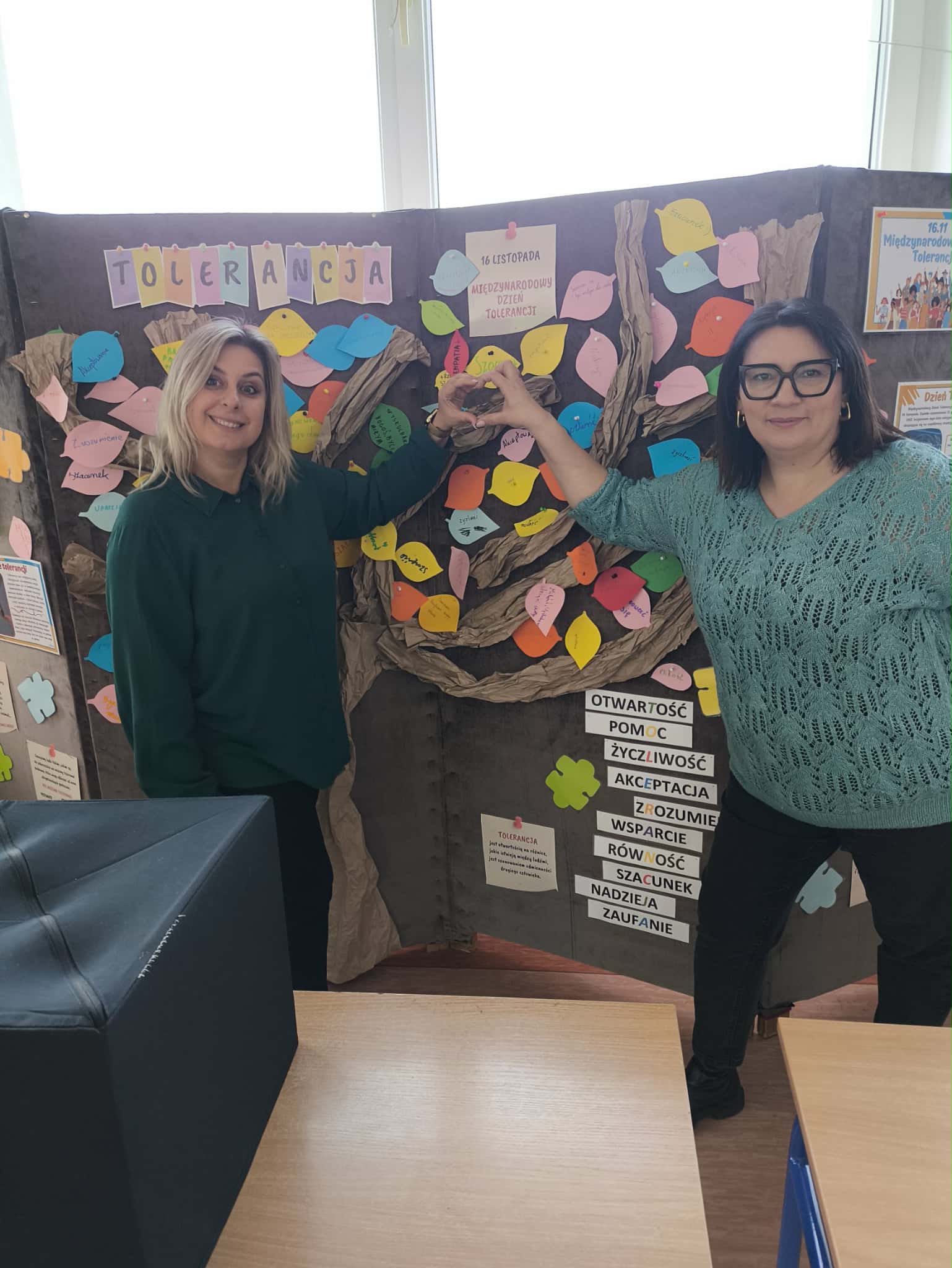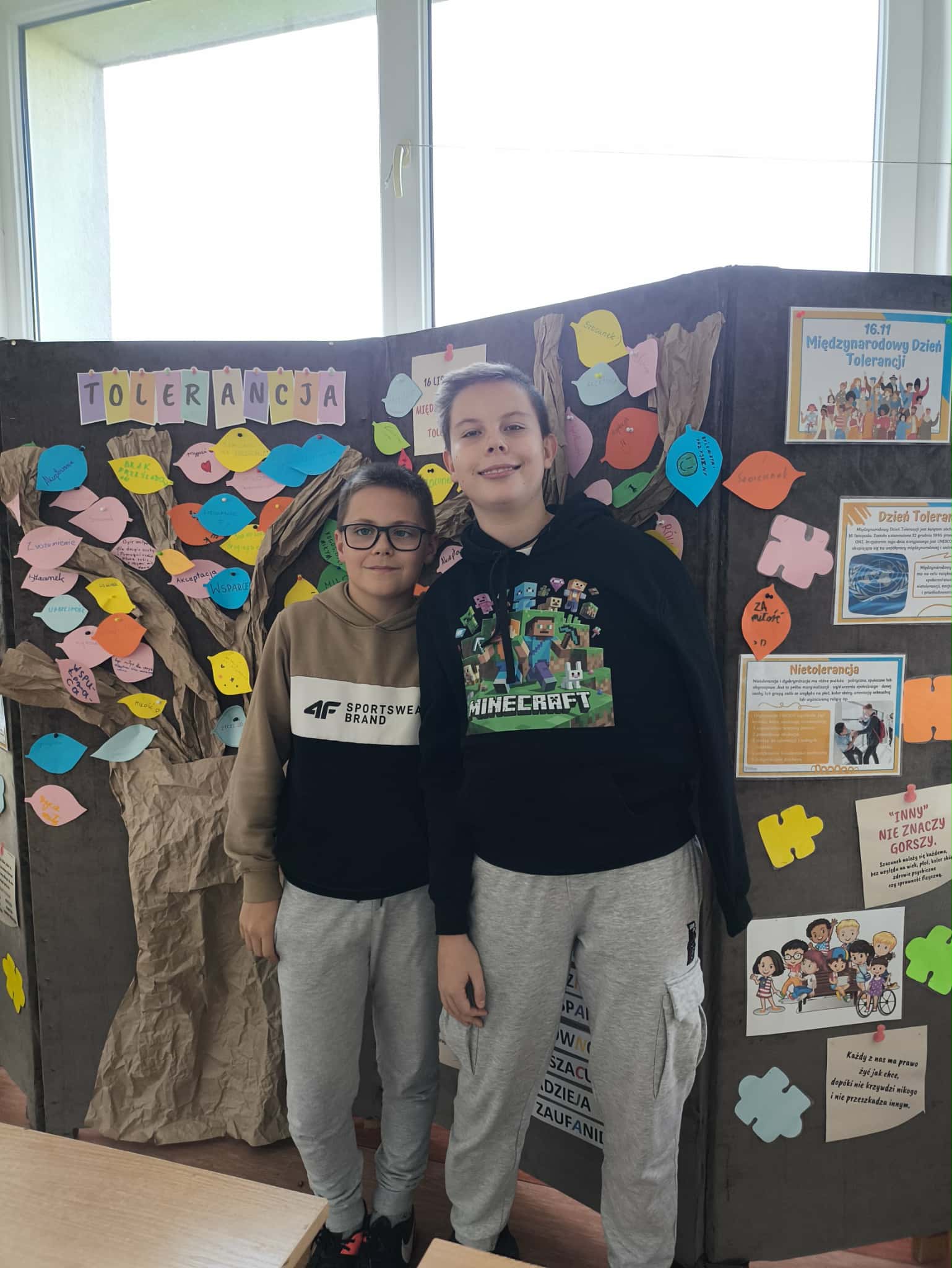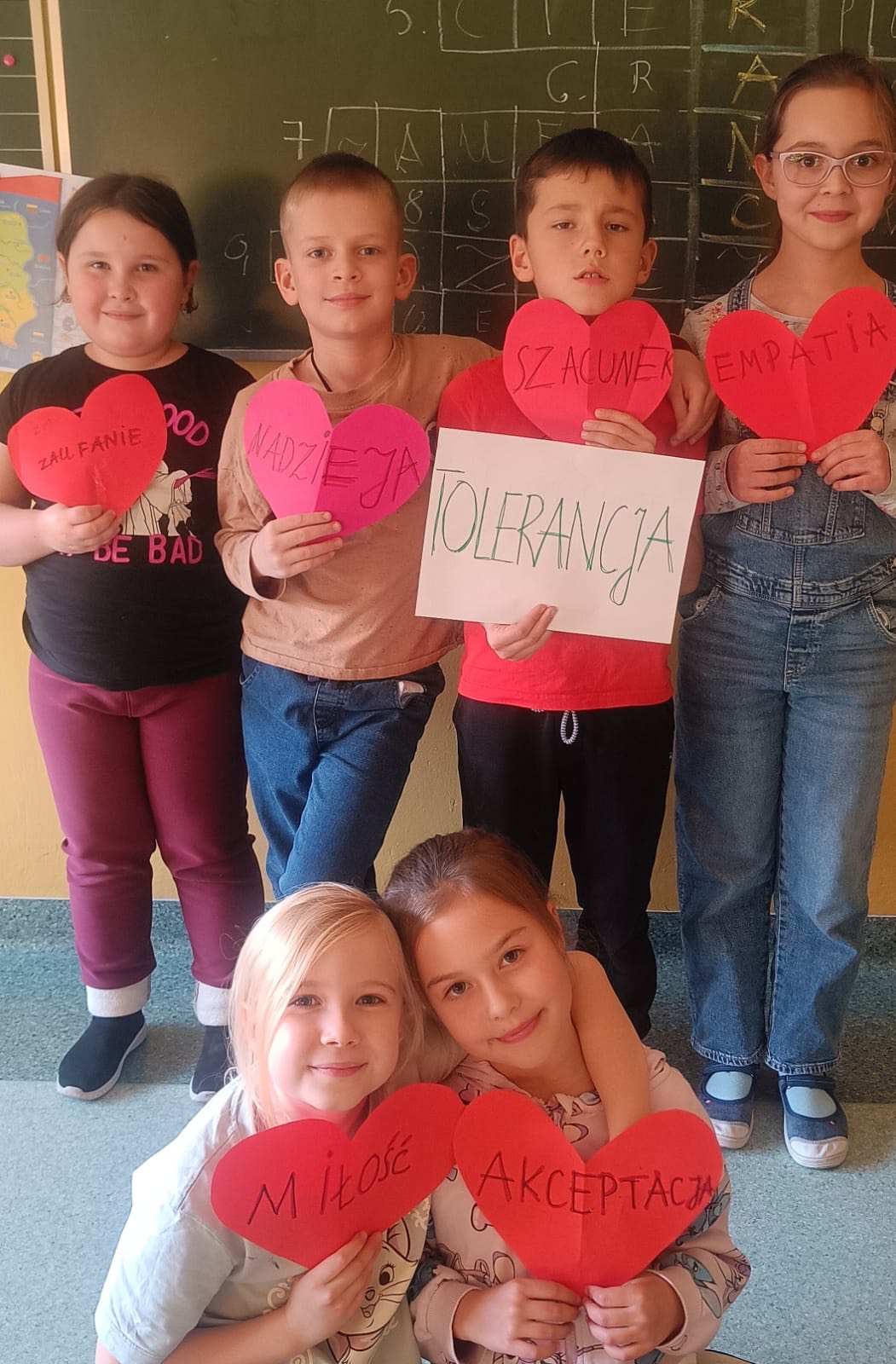 W czasie przerw uczniowie z klas 1-3 oraz kl.4-8 mieli okazję wziąć udział w różnorodnych aktywnościach, które w formie zabawy przybliżały im znaczenie tolerancji. Zajęcia zostały dostosowane do wieku uczestników, a ich forma zachęcała do aktywnego udziału. Dzieci tworzyły Drzewo Tolerancji, na którym umieszczały kolorowe listki ze słowami związanymi z tolerancją , akceptacją i życzliwością, układały puzzle z hasłami promującymi tolerancję oraz brały udział w Tolerancyjnym Kole Fortuny, gdzie czekały na nie zadania wymagające współpracy, refleksji i otwartości. Uczniowie chętnie uczestniczyli w zabawach, a szkolny korytarz tętnił pozytywną energią.