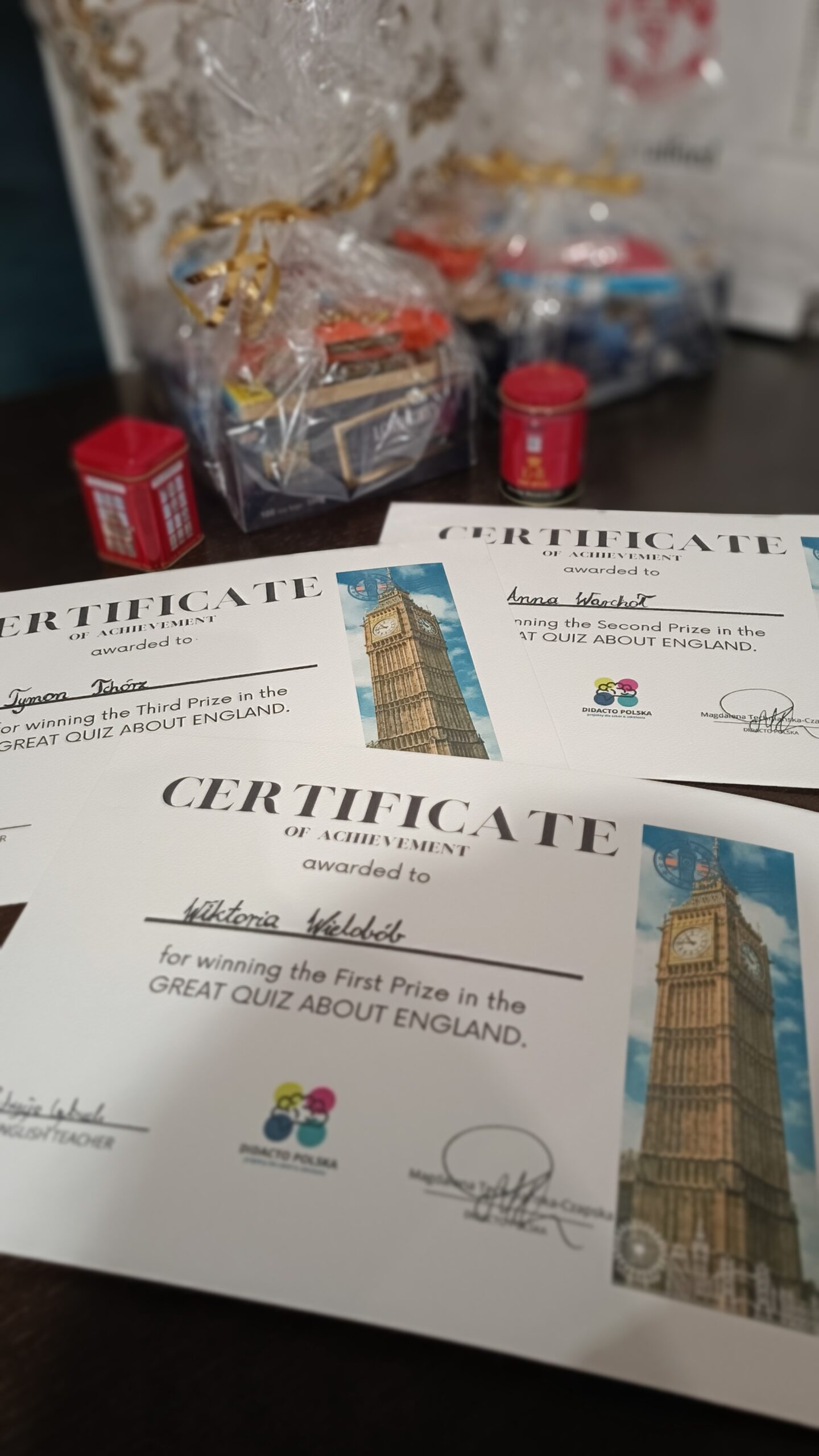 Laureaci otrzymali symboliczne nagrody nawiązujące do Wielkiej Brytanii. Wszystkim uczestnikom gratulujemy wiedzy i zaangażowania!