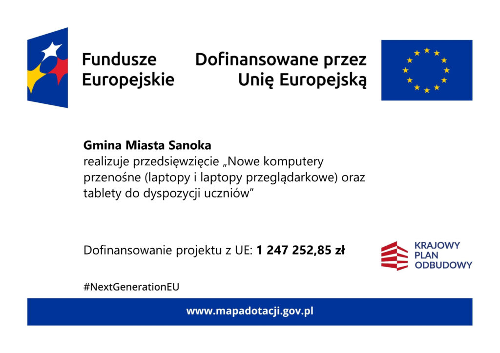 W ramach podpisanej umowy pomiędzy Gminą Miasta Sanoka a Ministrem Cyfryzacji, w imieniu którego działa Naukowa i Akademicka Sieć Komputerowa (NASK) – Państwowy Instytut Badawczy w Warszawie, Gmina Miasta Sanoka otrzymała łącznie 553 urządzenia o wartości 1 247 252,85 zł, w tym: