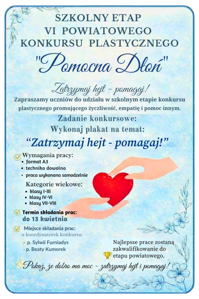 Serdecznie zapraszamy uczniów naszej szkoły do udziału w szkolnym etapie VI Powiatowego Konkursu Plastycznego „Pomocna Dłoń”, organizowanego przez Szkołę Podstawową im. św. A. Boboli w Kostarowcach we współpracy ze Szkolnym Kołem Wolontariatu.