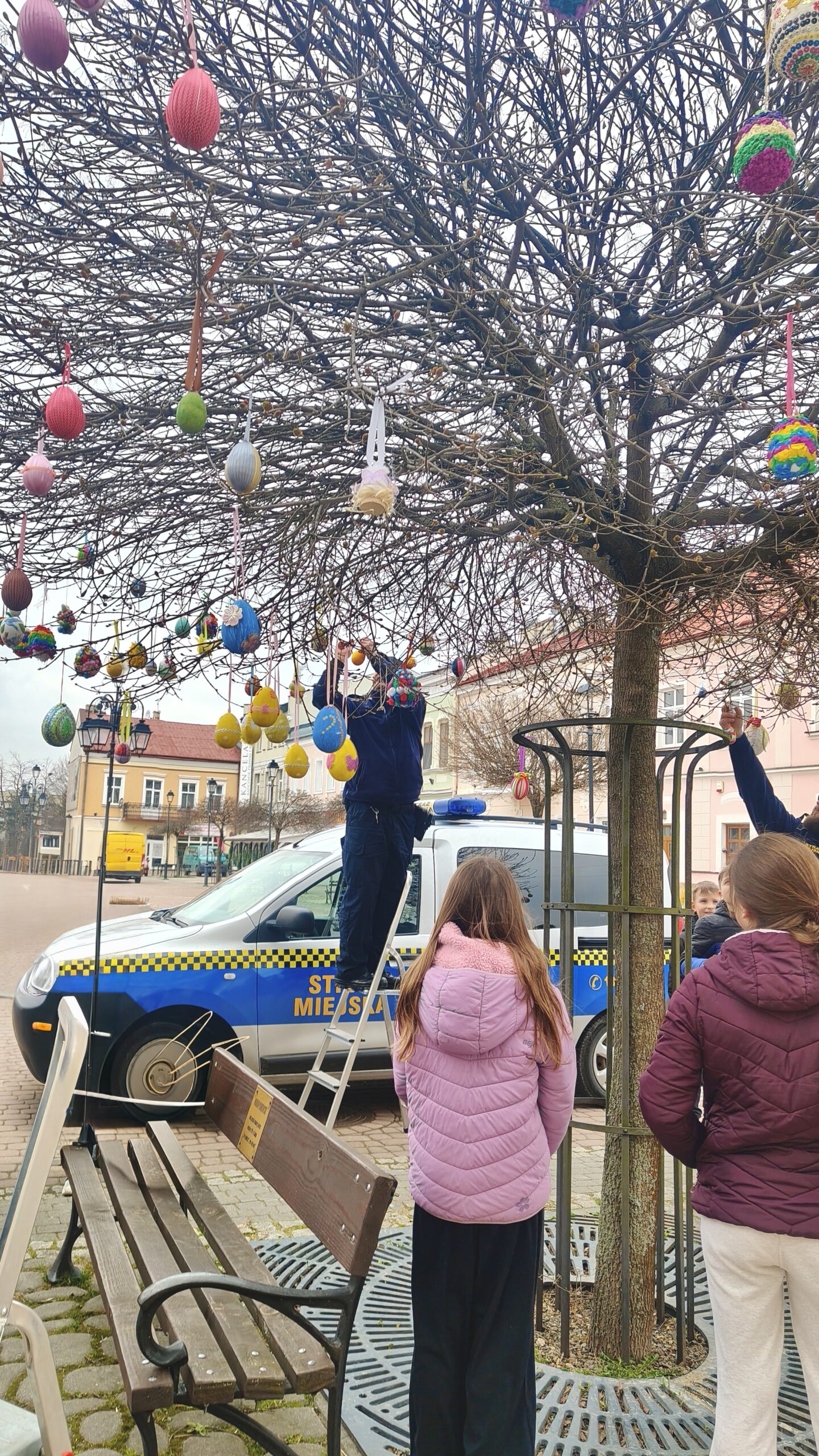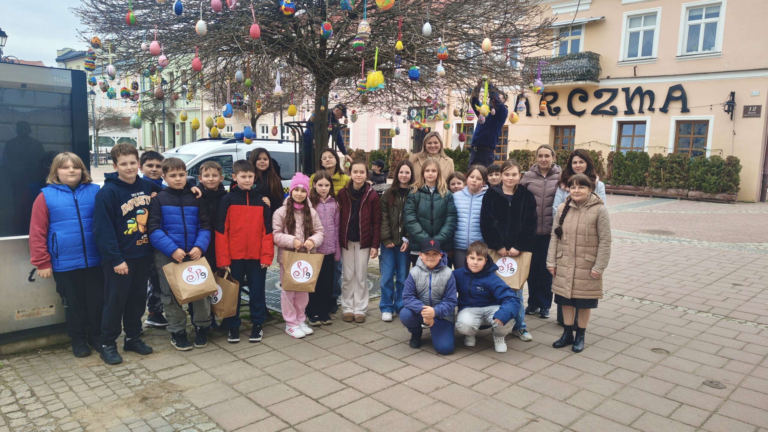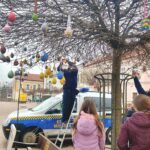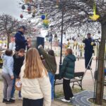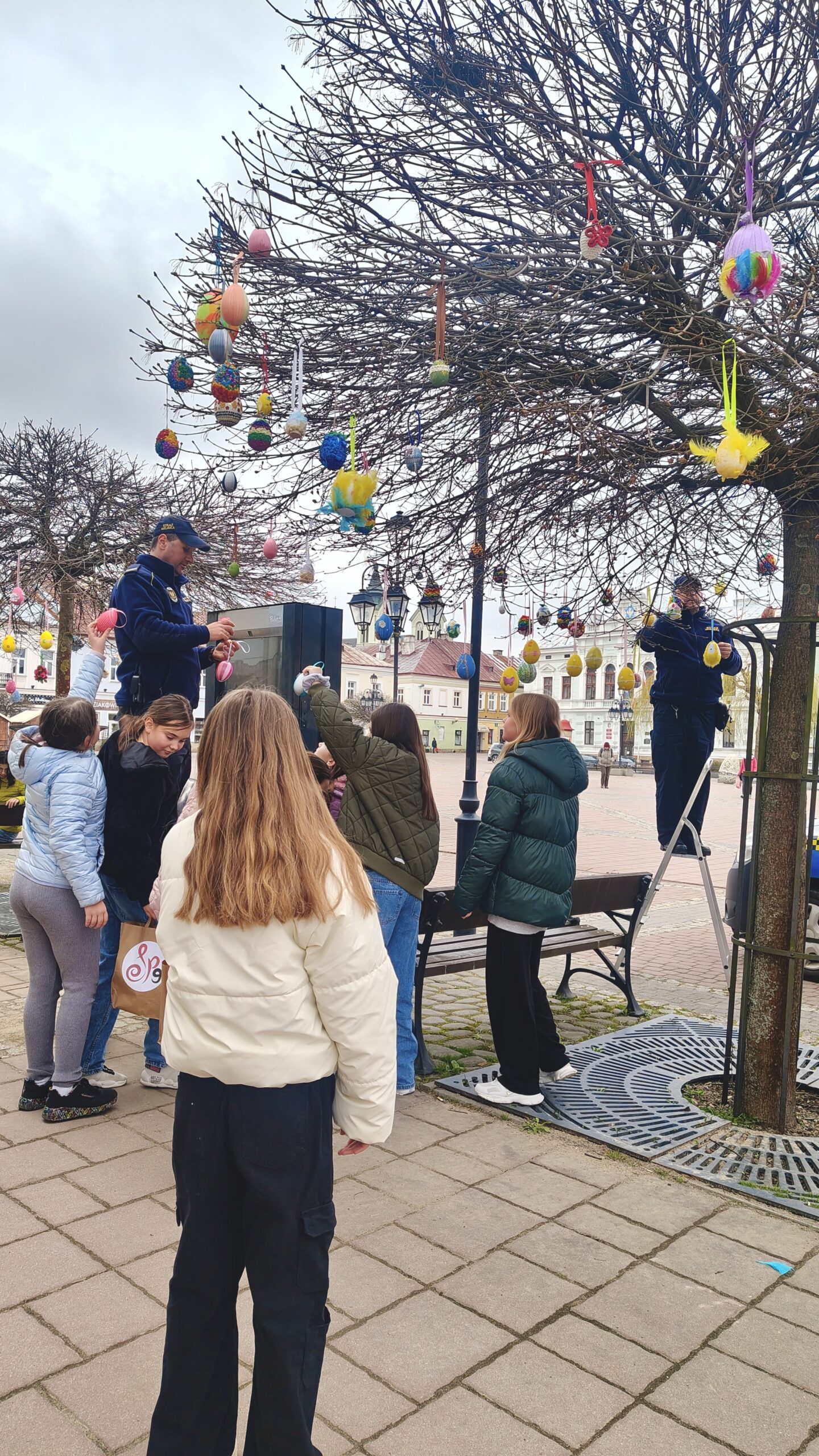 Naszą szkołę reprezentowali uczniowie klasy 4a, którzy pomagali zawieszać przygotowane pisanki na miejskich drzewkach. Wieszanie ozdób odbywało się przy wsparciu nauczycieli – pani Sylwii Furniadys i pani Anny Sieńko oraz pracowników Straży Miejskiej, którzy czuwali nad sprawnym i bezpiecznym przebiegiem wydarzenia.